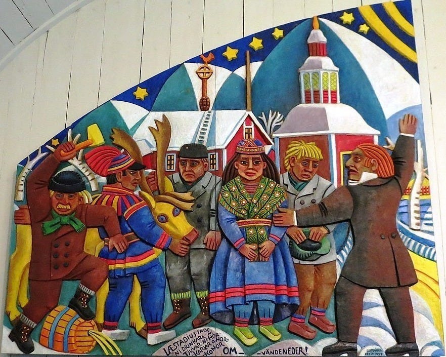 When people awakened from their desecrated lives, unconstrained, loud rejoicing occurred. Church services now involved fiery sermons, ebullient emotional outbursts, wailing, prancing, and a complete lack of decorum—similar to the old Sami shamanic ecstasies. They called this liikutuksia. This wasn’t quiet Swedish Lutheranism, but Wild Christianity—as wild as the landscape from which it emerged.